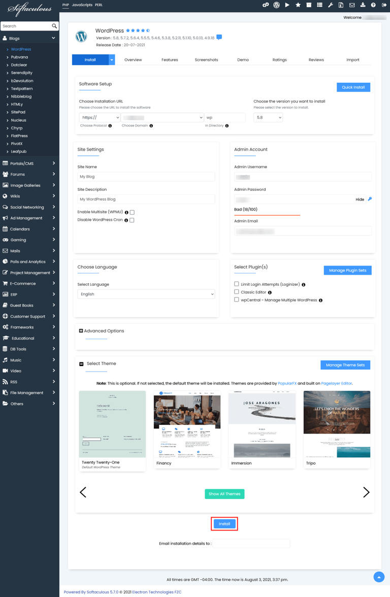 Inside Softaculous, you’ll see a search bar at the top. Type in "WordPress". Alternatively, you can find it under the "Blogs" category. Click on the WordPress icon.